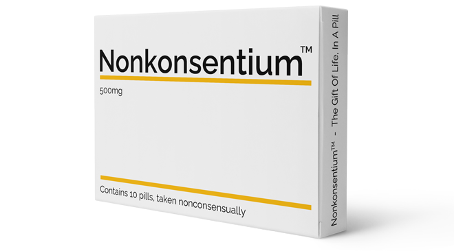 After years of research we are proud to present Nonkonsentium™, a new wonder drug that will make the world a happier place. Based on a rare new ingredient with a unique effect: As the name implies Nonkonsentium™ only works if it was administered without consent.